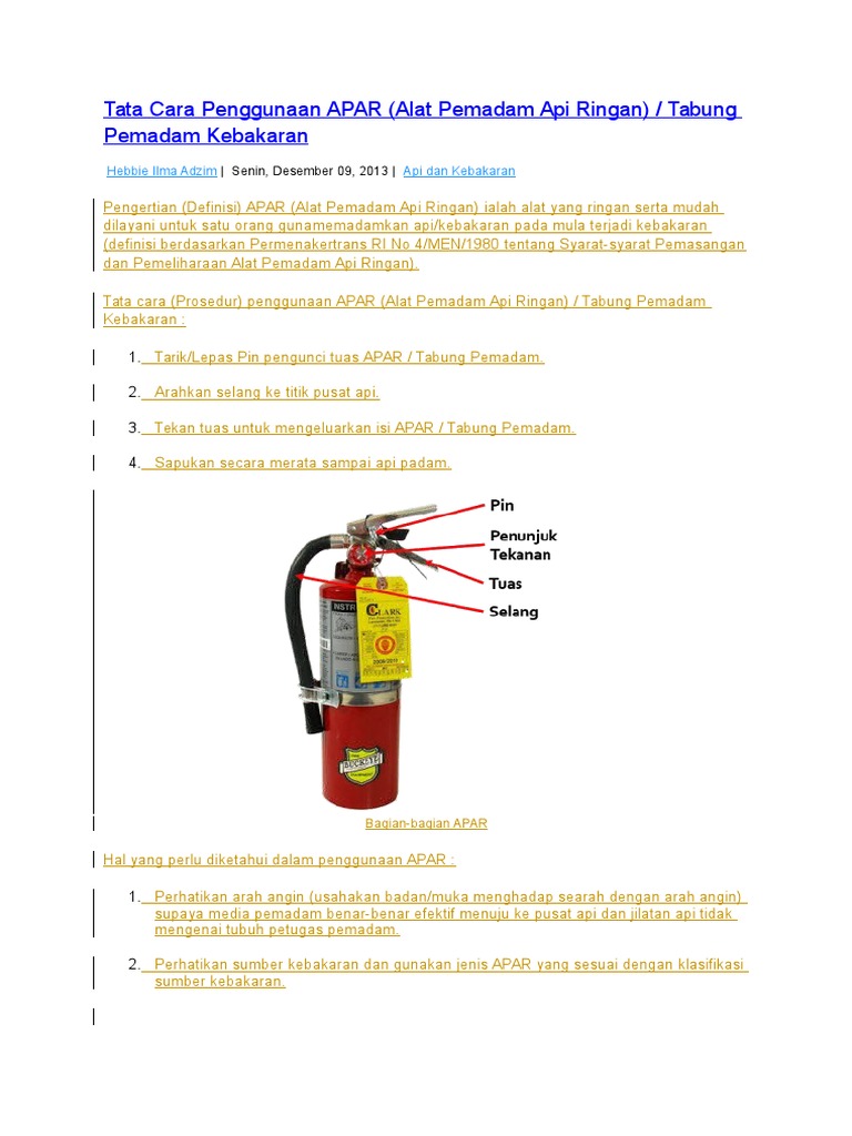 Cara Penggunaan Pemadam Api - Kita dapat menyebut cara menggunakan fire extinguisher ini dengan singkatan t.a.t.a yang dijabarkan menajadi. Tabung pemadam api jenis apar adalah alat pemadam api ringan yang dapat digunakan sebagai pertolongan pertama saat terjadinya musibah kebakaran. Berikut adalah video cara penggunaan apar : Petunjuk penggunaan tabung pemadam api. Apar atau alat pemadam api ringan jenis karbon dioksida sangat tepat jika digunakan untuk mengatasi kebakaran kelas b atau kelas c. Jenis busa adalah bahan pemadam api yang efektif untuk kebakaran awa minyak.